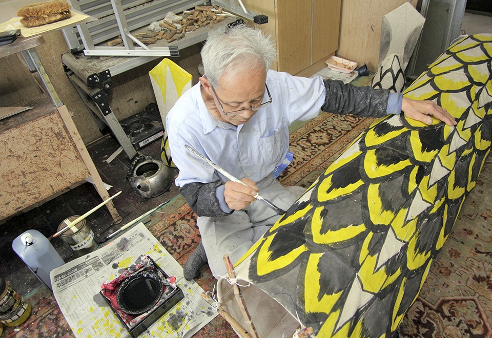 石見神楽面は、粘土型に和紙を何層も貼り重ね、柿渋を塗ることで補強され、軽さと汗に強い耐久性を実現しています。また、舞の中で、一際存在感を放つ龍や虎などの動物や植物などの神楽衣裳の模様も和紙を土台に刺繍されます。更に、約17mもある「大蛇」の蛇胴の躍動感あるリアルな動きを可能にしているのも、石州和紙(せきしゅうわし)の特性による所が大きいといえます。