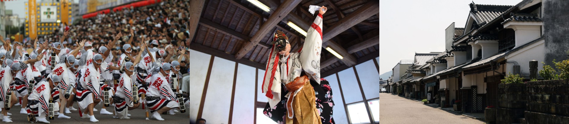 左:藍商人が育てた阿波おどり/中央:藍屋敷を訪ねる「三番叟」/右:うだつの町並み